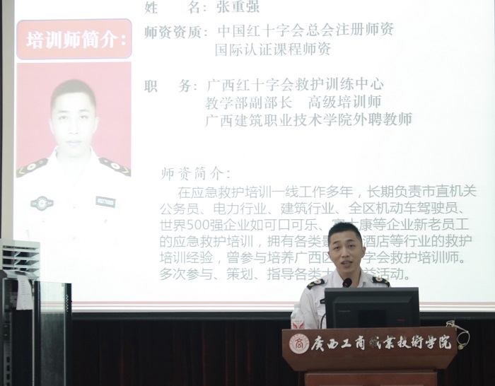 随后,广西红十字会救护训练中心的培训讲师进行2023年广西工商职业技术学院学生社团指导教师、团干部培训教学。
