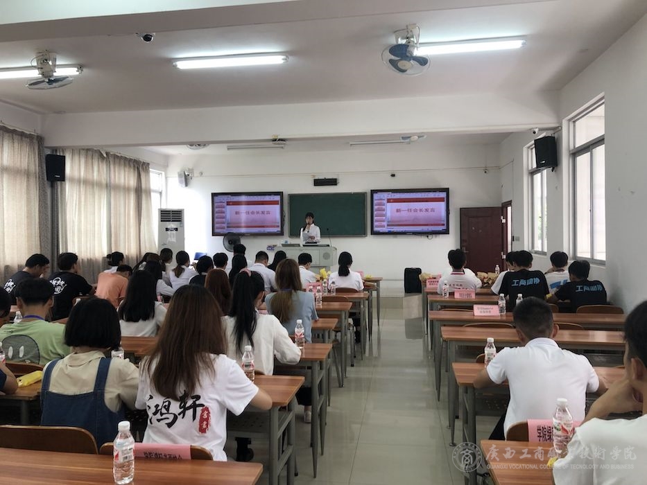 大会开始前,20级会干提前到达教室布置会场并组织学院各社团代表进行签到入场。大会正式开始,首先,由主持人介绍到场的嘉宾,以及介绍协会发展历史以及发展历程,并播放各社团的祝福视频;然后由指导老师周湘璟上台发言;紧接着,由19级会长李想进行发言,由指导老师给19级会干颁发聘书,20级会干给19级会干送花及祝福卡片;然后由19级会长李想宣读介绍新一届会干名单,并由19级会干给20级会干带上会牌;随后,由20级会长陆颖琇进行发言后并与19级会长进行会旗交接,最后由协会20级乐队进行节目表演,主持人致闭幕词,全体成员合影留念,本次换届大会圆满结束。