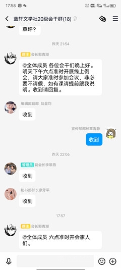 为了加强各部门会干之间的交流,以便后续社团工作更好的进行。学院蓝轩文学社于2021年11月30日下午,在QQ会干群里以线上会议的方式进行第三次骨干例会。参加本次会议的有社团20级全体会干,本次会议由会长郭青湖主持。