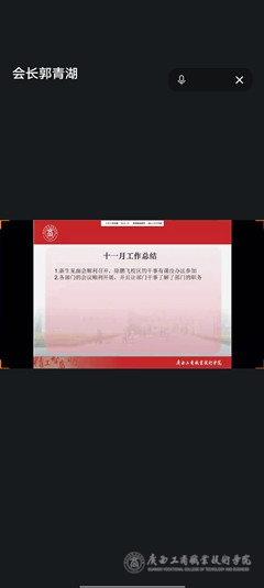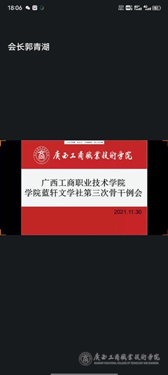 会议开始前,会长郭青湖在QQ会干群里开通语音通话,20级会干们陆续进入群语音通话。首先,由会长郭青湖宣布会议正式开始;接着,会长郭青湖对十一月份社团工作情况进行汇报总结;紧接着,会长郭青湖提出接下来十二月份社团工作的计划:一、让21级干事们开始上手部门工作,二、在十二月底召开第四次骨干例会;然后,会长郭青湖提出将要订购21级干事们的会牌内页,让各校区负责人收集21级干事们的一寸证件照;最后,会长郭青湖表示希望各部门的20级会干逐渐把协会的事务交给21级干事们进行,以便之后21级干事能够更好的接手学院蓝轩文学社的工作,从而把社团发展得更好。最后,由会长郭青湖宣布本次会干例会圆满结束。