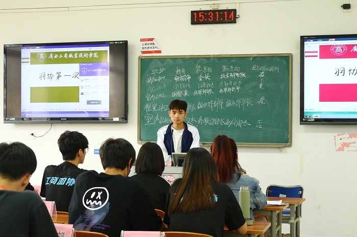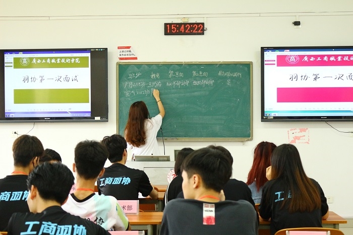 为学院羽毛球协会注入新鲜血液,增添新活力,学院羽毛球协会于5月15日下午,在鹏飞、中尧、武鸣三个校区以线上线下相结合的形式来进行面试,参加本次竞选面试的有协会20级会干和21级干事们,本次面试由会长赖琪文主持。