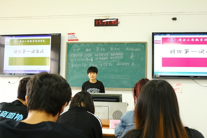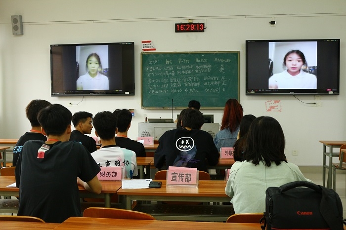 面试开始前,由20级会干提前到达教室并布置好面试现场,会长赖琪文提前准备好线上链接会议方便与中尧、武鸣两个校区连线,21级干事们陆续到达教室,秘书部部长梁露露负责收集好21级干事面试竞选表;准备完毕后,会长赖琪文宣布面试正式开始,21级干事们按顺序进行面试,首先进行自我介绍及竞选的职位,接着到各个部门负责人提问环节,21级干事们认真作答,在他们的回答中体现出对协会工作的一定了解,并且展示他们自身优势之处,面试现场紧张而有序的进行面试,各个环节有条不紊的展开。最后,由会长赖琪文宣布本次面试会议圆满结束。
