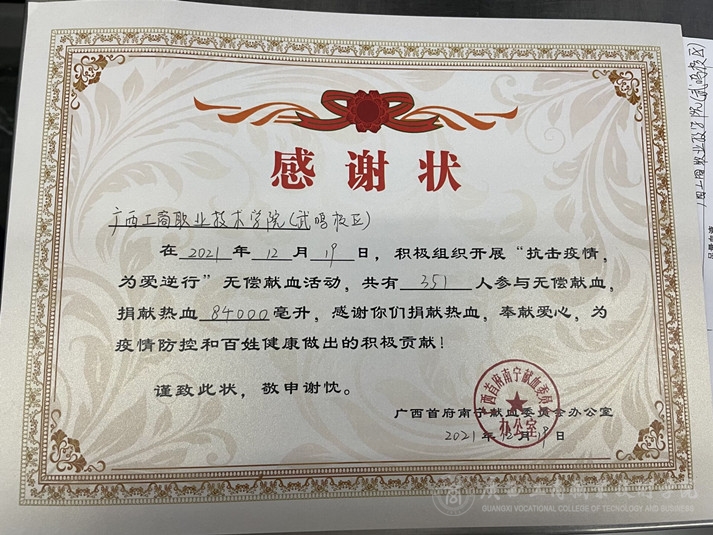 百年奋斗路,热血铸青春。2021年12月17、18、19日,学院团委联合南宁市中心血站在我院三个校区开展“百年奋斗路,热血铸青春”主题献血活动。 无偿献血是终身的荣誉,无偿献血者会得到社会的尊重和爱戴,献血活动通知...