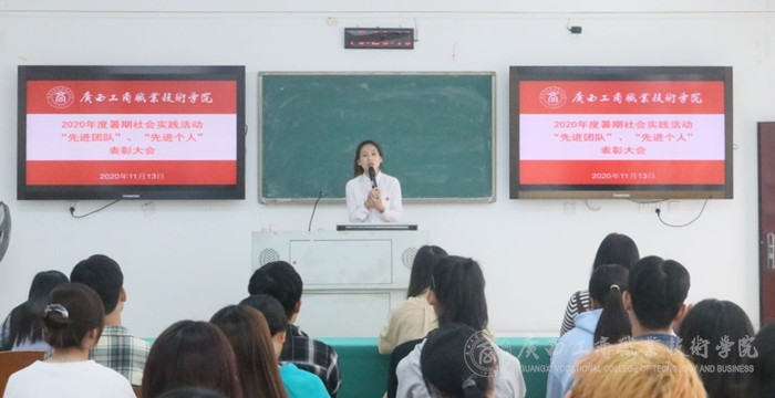 为了促进、加深大学生理论知识与社会实践相结合。校团委于2020年11月13日下午在鹏飞校区教学楼开展2020年度大学生暑期社会实践活动表彰大会。本次大会由20级实习委员曾志滨与莫嘉琪主持。大会开始,全体人员起立共唱...