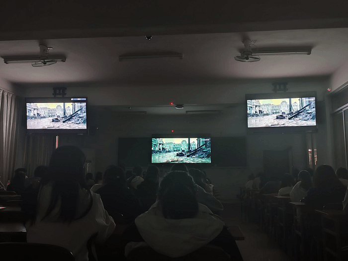 活动期间,各校区集中组织观看了反映中华民族英勇抗战精神的经典影片《八佰》。观影过程中,同学们沉浸于那段波澜壮阔的历史岁月,深刻感受革命先辈为民族独立与人民解放不畏牺牲、顽强斗争的崇高精神。影片结束后,同学们结合观影感受展开交流,纷纷表示要从抗战历史中汲取精神力量,进一步坚定理想信念,将爱国之情、报国之志转化为勤奋学习、锤炼本领的实际行动。