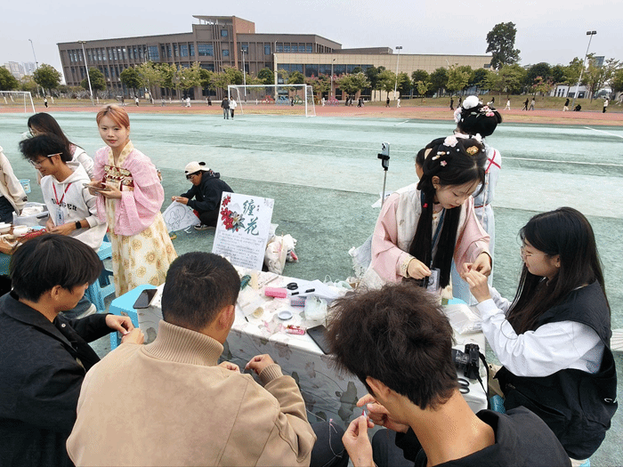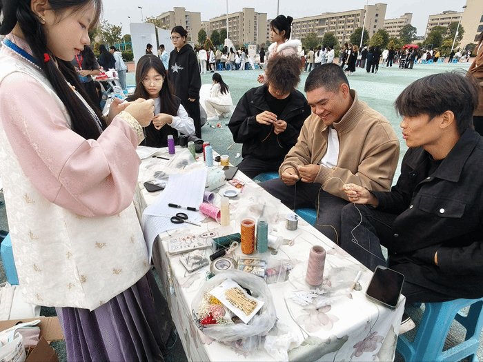 活动现场古韵盎然。协会成员身着传统汉服,为活动营造出典雅的文化氛围。在她们细致耐心的讲解与示范下,参与者们手持丝线、花片与铜丝,学习缠、捻、绕、结等基础技法,于一针一线的专注缠绕中,将素雅的材料逐步转化为一枚枚精巧别致的缠花饰品。现场气氛专注而愉悦,传统手工艺的魅力在指尖流转中生动呈现。