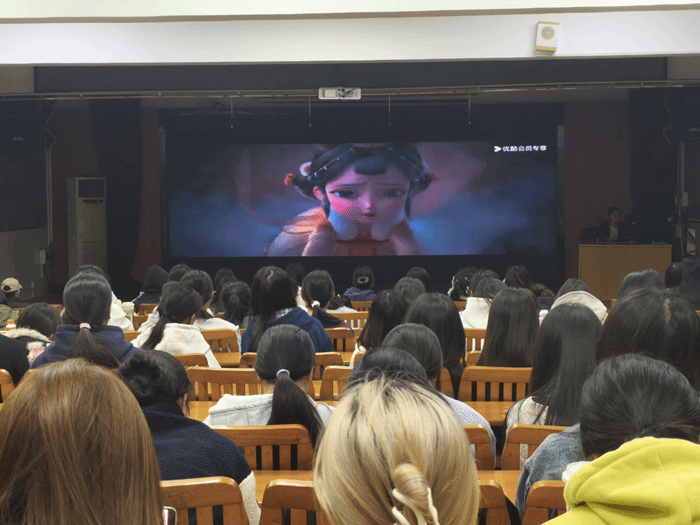 活动开始前,同学们有序签到入场。影片《聊斋・兰若寺》播放期间,同学们沉浸于影片所呈现的奇幻场景、考究的服饰细节以及蕴含东方哲思的剧情中,通过现代动画技术生动感受了蒲松龄笔下古典文学的魅力。观影过程中,大家时而为聂小倩的命运屏息凝神,时而为影片中细腻还原的传统服饰元素而赞叹,深刻体会到古典文化与现代表达形式相结合所带来的独特感染力。